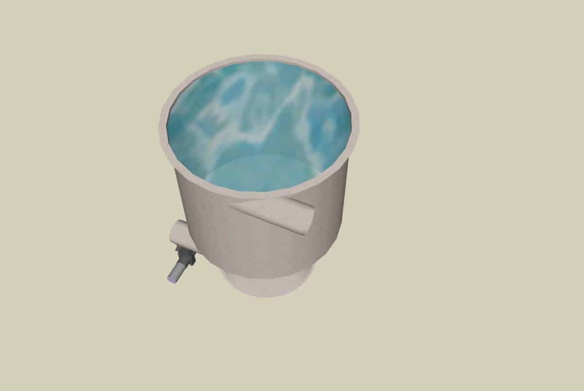 De vortex is gewoon een leeg rond vat met een conische bodem. (het diepste punt bevindt zich in het midden op de bodem – trechtervorm) en heeft als doel het ontlasten van het filtersysteem met organisch afval. Zo kun je het spoelen van de mechanische filtermaterialen verminderen en blijven de biologische filtermaterialen tot een minimum belast van organisch vuil.