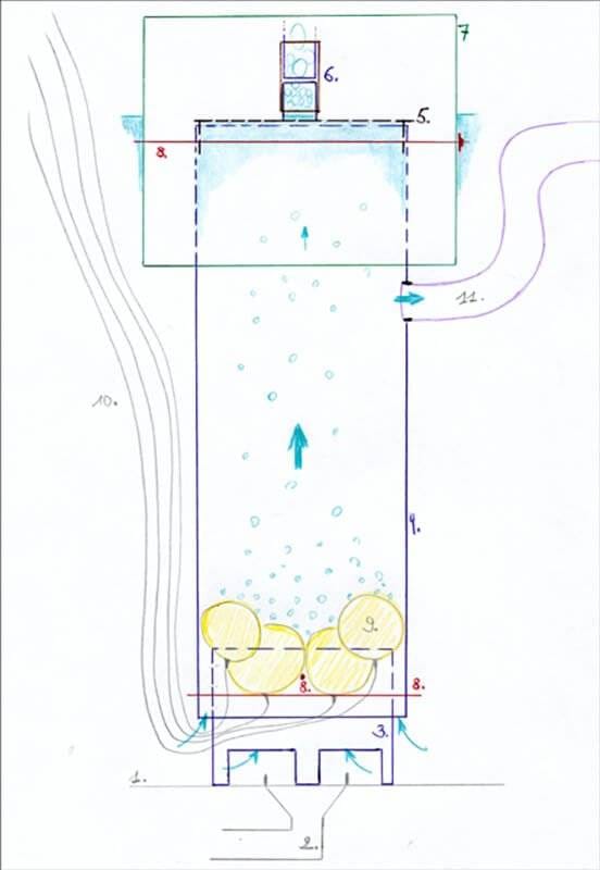Dit is een experimenteel model, en dus gebouwd om ervaring met het toestel op te doen. Nu zou ik het anders aanpakken : een aparte plaatsing vlak voor het biologische compartiment, langere schuimkulom en geen horizontaal deksel bovenaan maar een schuin oplopend.