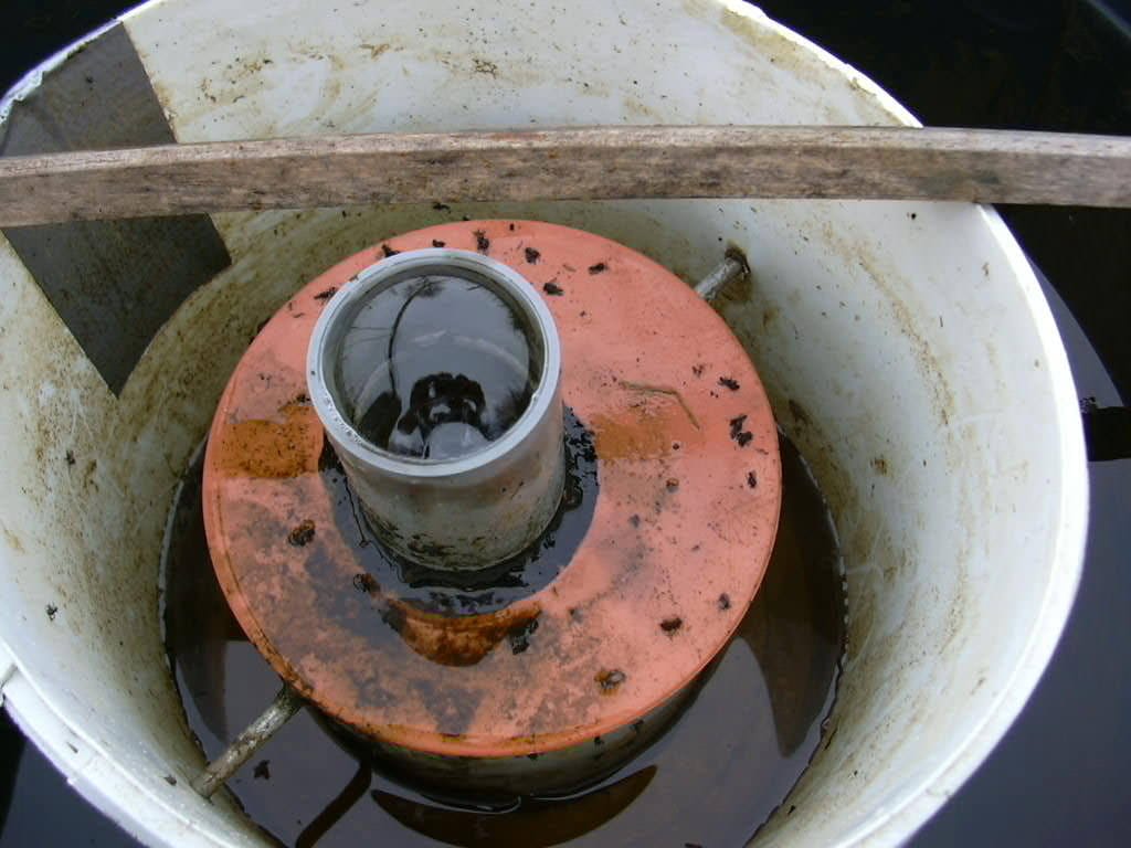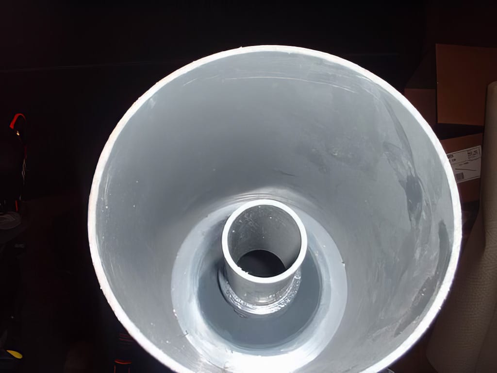 - De schuimbeker. Bij mij is dit een 5 liter emmer, die onderaan perfect rond de PVC buis past en aldaar afgedicht is met siliconen zodat er geen water uit de vortex in kan lekken. Halfweg is ze ook nog eens bevestigd met een hechtingsstaaf voor verdere stabilisatie.