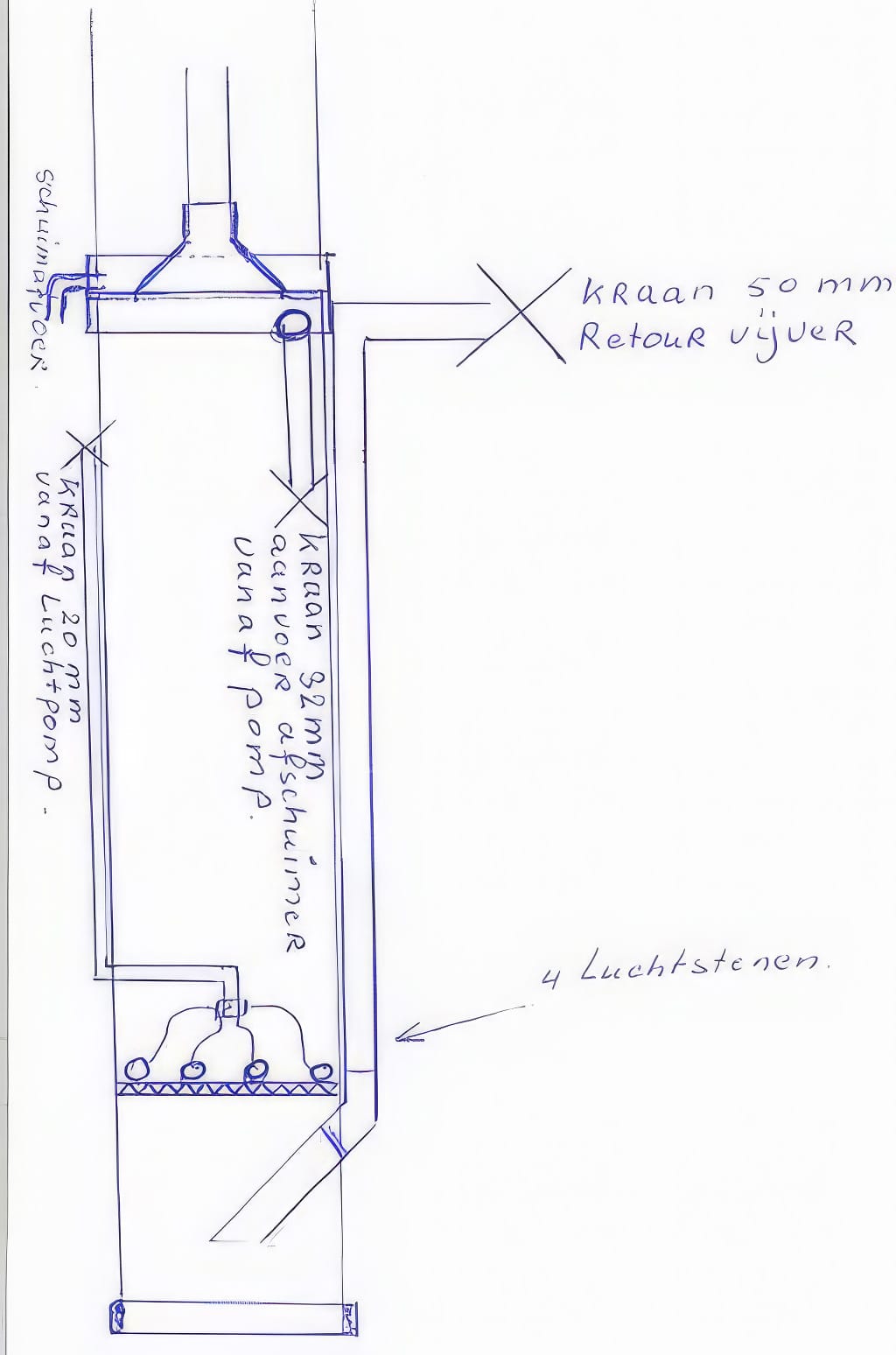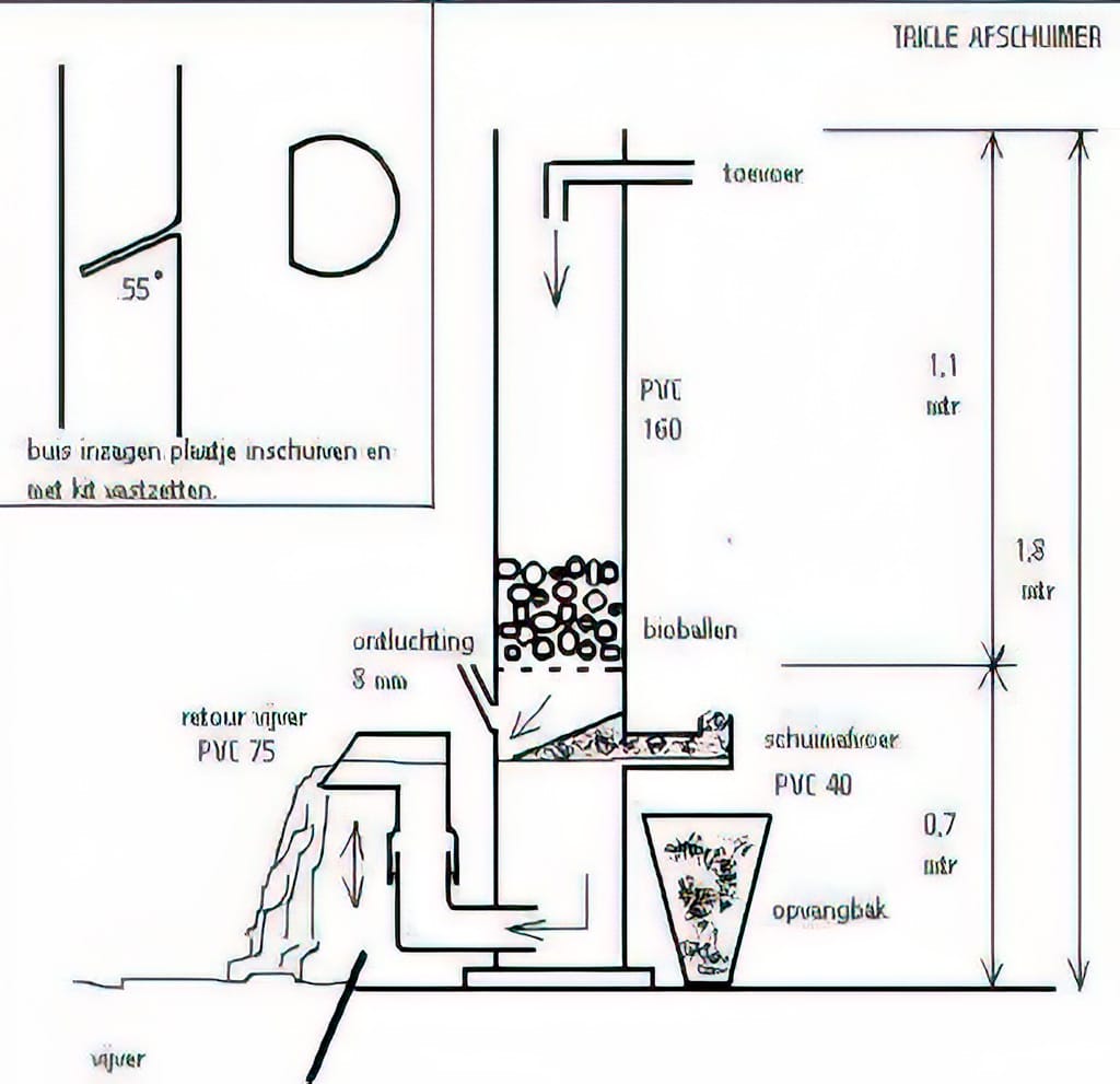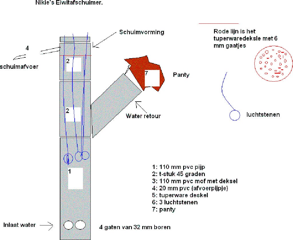 Het vervolg van deze paragraaf is een dankbare bijdrage van Jan Droesen ( koi house ) die reeds in 1997 met eiwitafschuimers aan het experimenteren was.