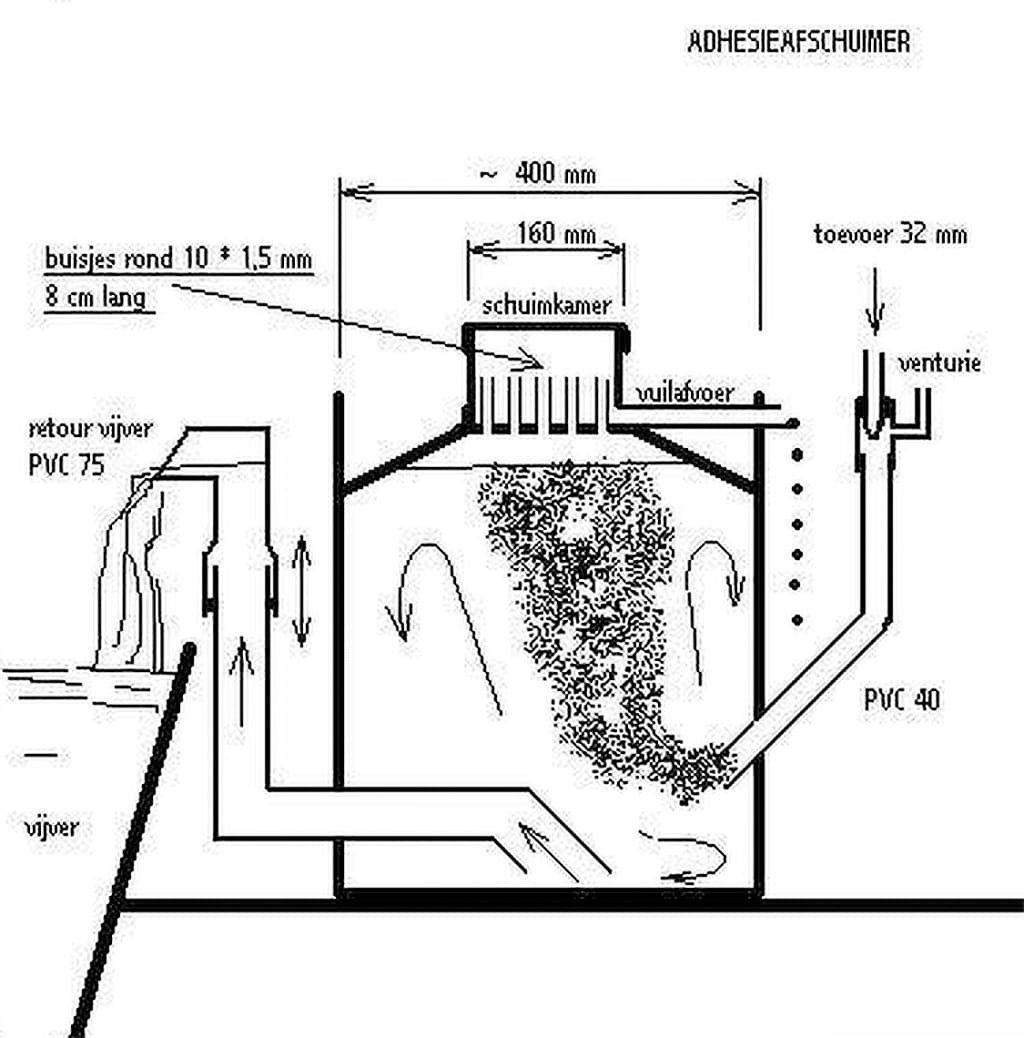 Bij dit type afschuimer zit in de toevoer een venturie gemonteerd welke de lucht inbrengt voor schuimvorming. Tevens zorgt de venturie voor een goede menging van lucht en water. Blijkt de luchttoevoer te gering, dan kan men nog een luchtsteen aanbrengen. De luchtbelletjes stijgen op en verzamelen zich in de ruimte onder de schuimkamer. Schuimopbouw onder deze kamer zorgt ervoor dat het schuim in een 20 tal kleine buisjes wordt gedrukt (10 * 1,5 mm). De adhesie kracht van het schuim op de binnenwanden van de buisjes zorgt er voor dat het schuim niet voortijdig in vloeistof terug valt. Dit zou betekenen dat het weer via de binnenzijde van de buisjes terugloopt. Zodra het schuim uit de buisjes komt, loopt het aan de buitenzijde van de buisjes naar beneden. Via de bodem en het afvoerpijpje loopt het naar het riool. Het is uit de vijver kringloop onttrokken. Het waterniveau onder de schuimkamer is af te stellen door montage van een riulering expansiestuk in de retourleiding. Het waterniveau mag niet te hoog worden afgesteld omdat anders te veel water wordt afgevoerd. Is het waterniveau te laag dan komt er geen schuim uit. De doorvoer is ca. 6 m3 / h. Op de schets is de afschuimer weergegeven die op mijn koivijver is geplaatst.