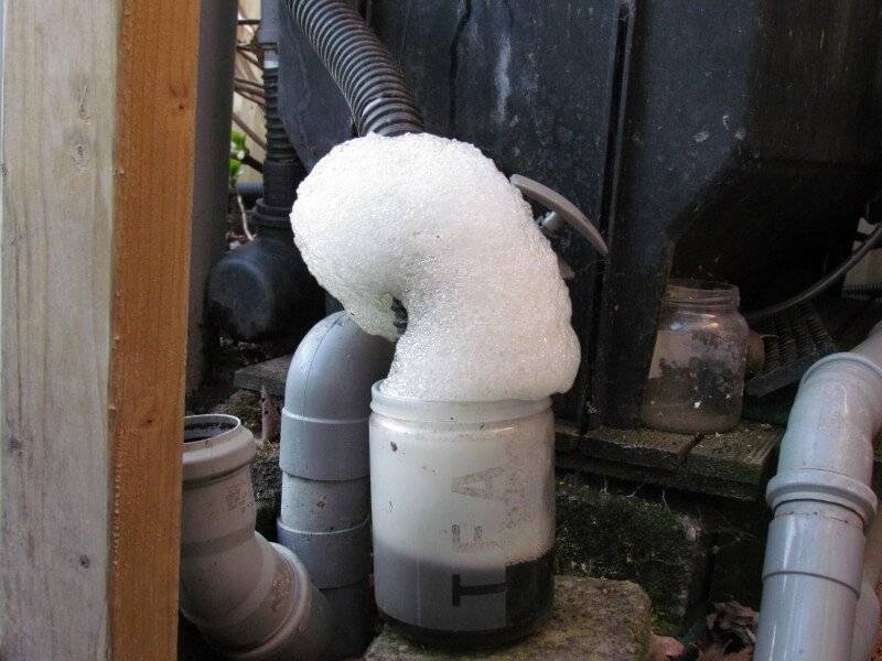 Deze afschuimer bestaat uit een PVC pijp van 160 mm doorsnede en 1,80 mtr lang. Deze is aan de onderzijde afgesloten middels een lijmkap. Ongeveer 20 cm boven de schuimuitloop is een bodem (b.v. bodem van een plantenkorf) aangebracht. Hierop brengt men ca. 10 liter bioballen aan. Deze bioballen zijn in de handel te verkrijgen. Het schuim wordt gevormd doordat het toegevoerde water op de bioballen slaat en hierbij verdeeld wordt. Net boven de schuimuitloop is een dunne plaat aangebracht (een zaagsnede dik) die schuin in de buis is aan gebracht. Deze is noodzakelijk om het gevormde schuim te beschermen voor het kapotslaan door nakomende water. Tevens zorgt deze plaat voor drukopbouw om schuim naar buiten te drukken. Het waterniveau onder de schuine plaat is af te stellen door montage van een riolerings expansiestuk in de retourleiding. Doorvoer ca. 8 m3 / uur. Zie voor verdere dimensionering schets (foto “Jan Droesen1).