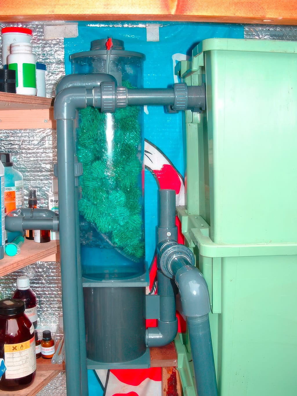 - Het idee om met een eiwitafschuimer te gaan experimenteren is pas gegroeid nadat de oorspronkelijke filter reeds draaiende was. Daarom heb ik wegens plaatsgebrek de eiwitafschuimer centraal in de vortex geplaatst. Ik moest nl. een plaats vinden voor het biologische compartiment (een skimmer heb ik niet) en die plaats moest dan ook nog voldoende diep zijn, dus dit was dan de beste keuze.