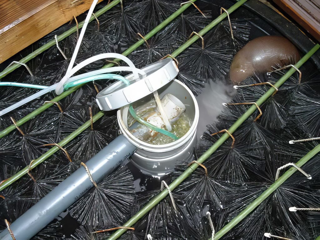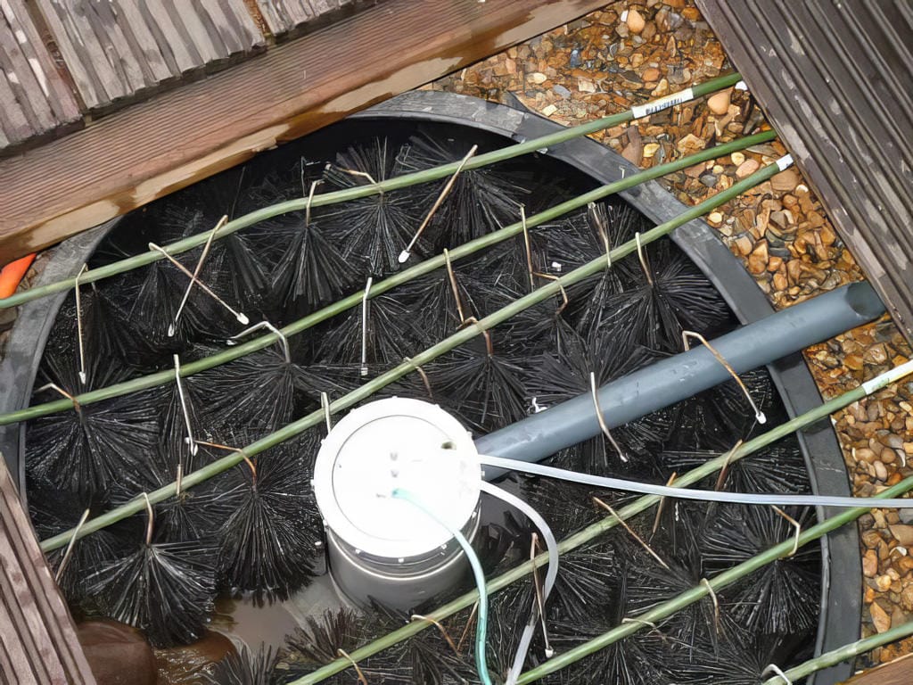 - Dit zijn de luchtstenen waar uiteraard lucht door gepompt wordt zodat we een naar boven gerichte water/lucht-stroom opwekken. Zo ontstaat er bovenaan schuim waaraan vuildeeltjes gehecht zijn.