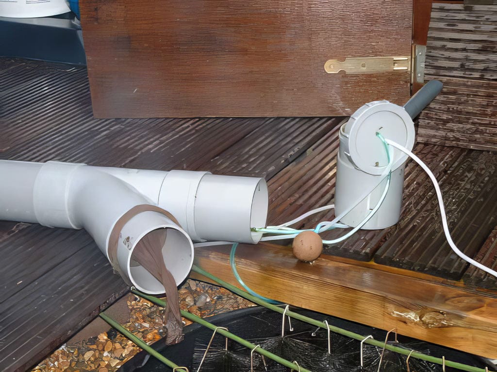- Opdat al het water dat door de pomp aangevoerd is, ook de eiwitafschuimer zou passeren, is hier de verbinding met de verdere filter voorzien. Dit is dan een flexibele PVC buis die als overloop naar de tweede filterkamer fungeert.