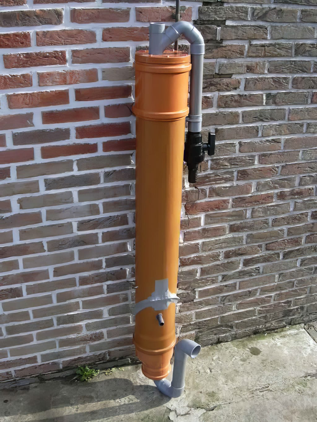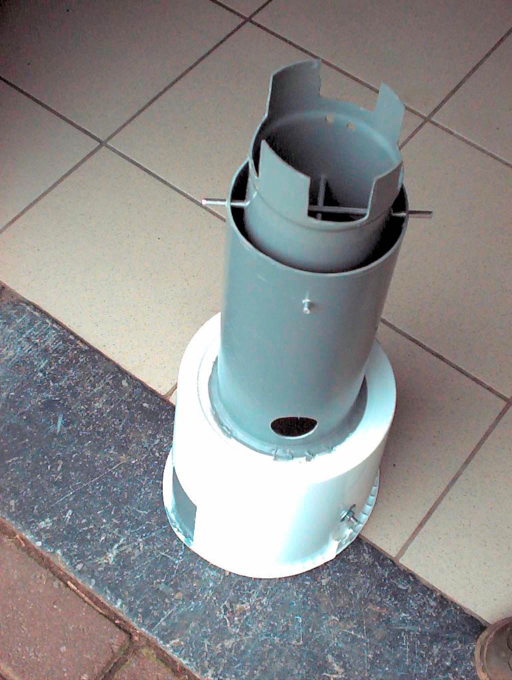 - Bovenaan is buis 4 met een deksel (dat perfect erin past) waterdicht gemaakt. Met wat siliconen erbij (langs de binnenzijde waar het deksel en de buis elkaar finaal raken) heb ik gegarandeerd geen lekkage. Er bestaan kopstukken die geleidelijk naar boven toe versmallen, die voldoen waarschijnlijk nog beter.