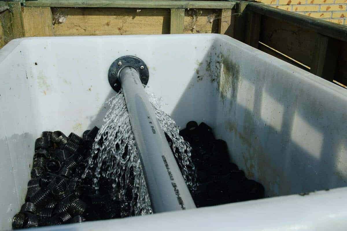 Vijverpomp aan en biologisch filteren met waterdruppels d.m.v. een zelf gemaakte druppelfilter.