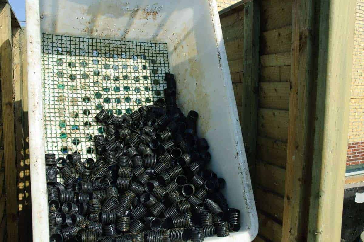 In de bodem van de bovenste stapelbak boren we over de volledige oppervlakte gaten zoals te zien is op de foto. Maak deze gaten best niet té klein maar voldoende groot voor goede doorstroming.