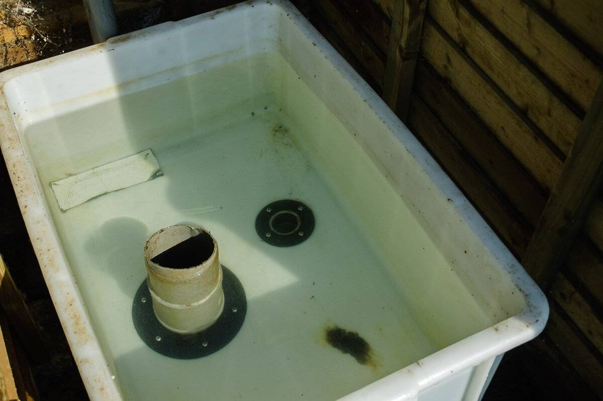 Hier voorzien we een terugloop naar de vijver met een 110 mm PVC buis (A) en een vuil afvoer (B). Voor het makkelijk waterdicht maken van de terugloop naar vijver en de vuil afvoer gebruikte ik respectievelijk een 110 mm en 50 mm wanddoorvoer die ik verlijmde en stevig vastschroefde aan de bodem van de onderste bak.