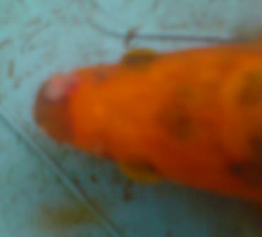 Afgelopen dinsdag ontdekte ik dat 1 van mijn koi's een wondje op zijn neus heeft, en er zat een lichte witte waas over (zie de witte stip op de neus).