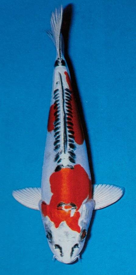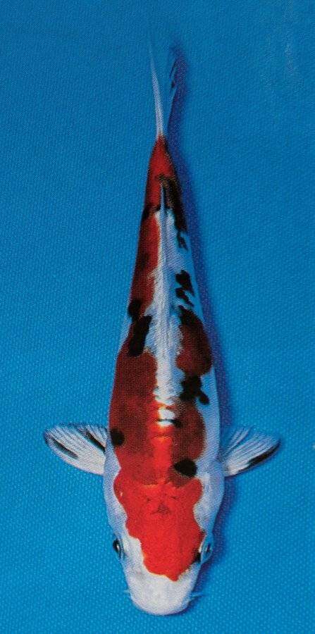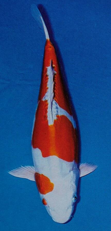 Deze KOJAKU heeft dieprode patronen over het hele lichaam, overgoten met zilveren glans. Het is een prachtige, maar zelden te aanschouwen koi.