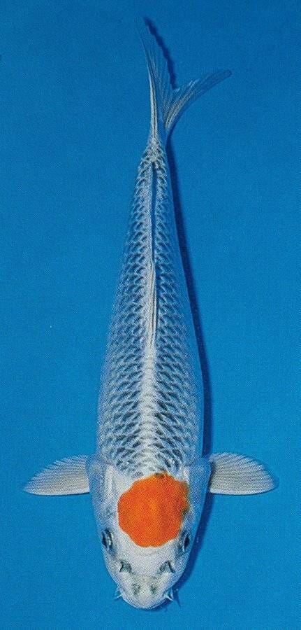 Dit is een platina koi met grote HI patronen die het grootste deel van het lichaam bekleden. De schubben zijn overlapt met een zwart MATSUBA PATROON. (netpatroon)