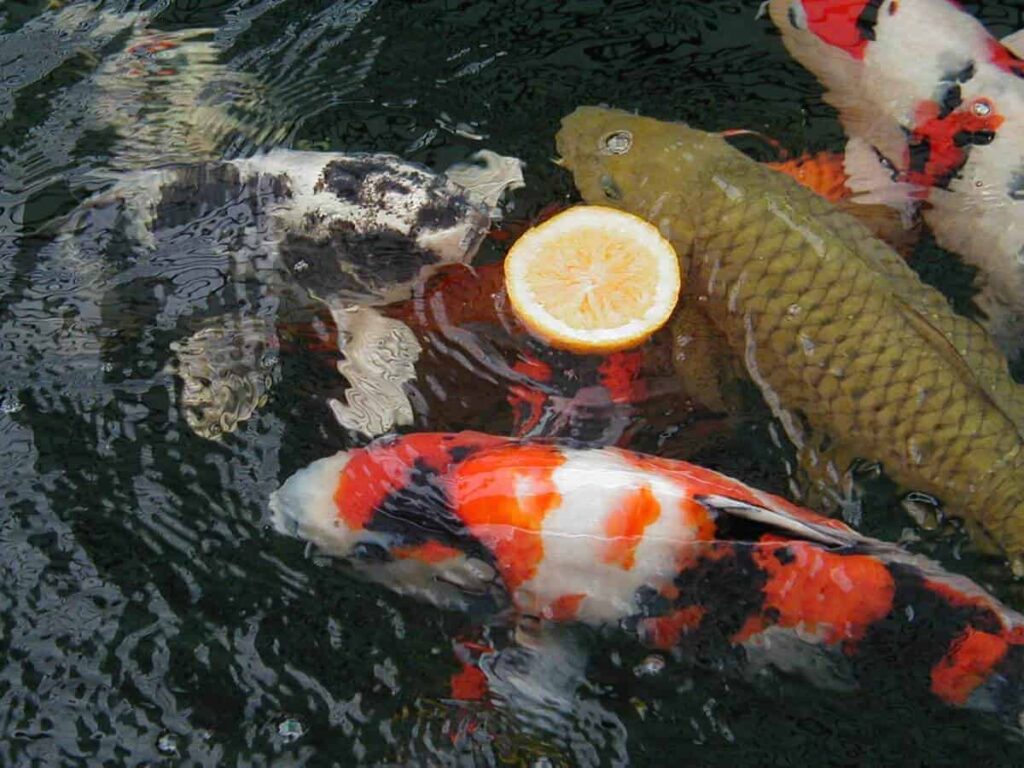 Om het rondzwemmende koi leven te doorbreken geef ik de zomerperiode mijn koi wel eens een half doorgesneden appelsien. Ze amuseren zich kostelijk om er het vruchtvlees uit te halen. Dit kan ook met een watermeloen of ander fruit