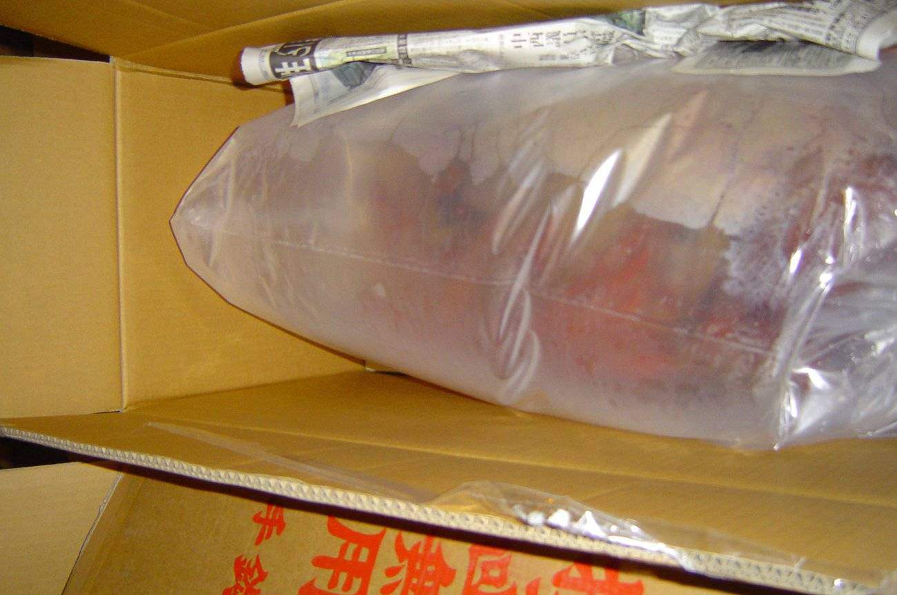 Daarvoor nemen we best twee plastiek zakken. De kans op lekkages is minder groot en het geheel is sterker, we kunnen de zak met de koi dan beter optillen. We vouwen de zakken bovenaan samen, zo krijgen we een stevige kraag voor het tillen en kunnen we de plastiek zakken é énvoudiger openhouden. We zijn nu klaar om de koi op te vangen in de plastiek zak. We vullen de plastiek zakken met water uit het inspectievat en houden de plastiek zakken wijd open zodat we de koi ermee kunnen opscheppen. We voorzien de zak van een voldoende hoeveelheid vijverwater. Belangrijk want de plasteik zak komt straks plat te liggen in een doos. De koi moet zich voldoende in het water bevinden. Eénmaal de koi opgenomen is in de zak kunnen we hem in zijn doos brengen. De beste dozen zijn die dozen waarmee ze vanuit Japan naar hier komen. Ze zijn smal en lang, ideaal om de zak stevig in vast te houden aan alle kanten. Vraag er eentje bij je koidealer en hou de doos bij voor toekomstige aankopen. Koi handelaars zullen nu extra zuurstof toedienen en eventueel een product om de koi wat rustig te houden voor het transport. Als je maar enkele kil ometers hebt te rijden dan is dit niet echt een noodzaak om te doen. Belangrijk is nu dat we de plastiekzakken luchtdicht maken zodat geen lucht verloren kan gaan. We nemen de uiteinden en maken er een sterke knoop van die we met een tweetal elastieken samenbinden. Uiteindelijk leggen we de plastiek zak plat in de doos en vouwen de doos dicht. Let op dat de koi zich voldoende in het water bevindt. Heb je hiermee geen ervaring dan vul je best eens op voorhand een zak en leg hem in de doos, zo weet je meteen of je al dan niet meer water moet toevoegen. We plaatsen de doos in de koffer van de wagen, goed donker en stevig zodat de doos tijdens vervoer niet kan opvallen of verschuiven.
