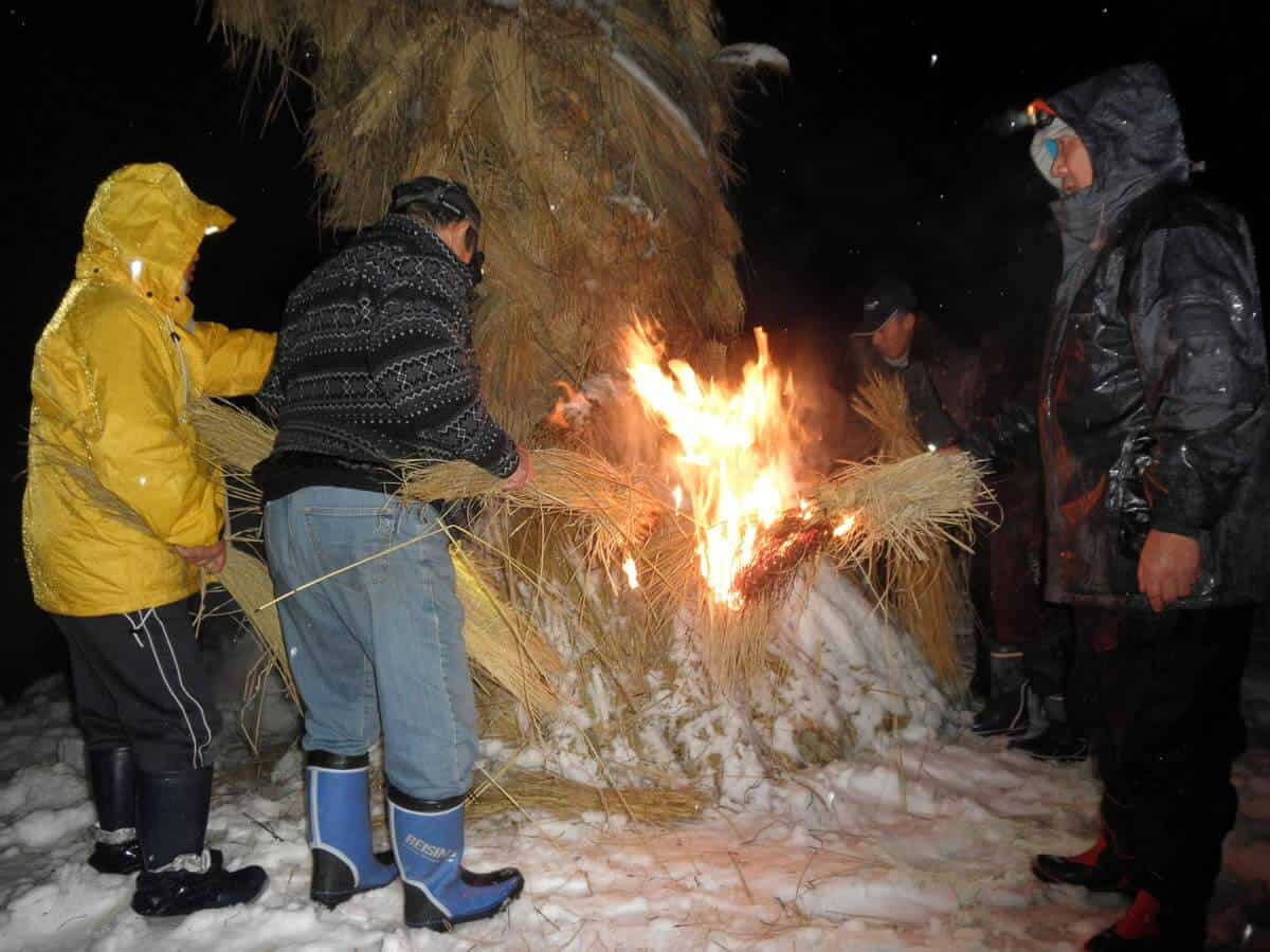 Het vuur voorspelt hoe het nieuwe jaar eruit zal zien. Leidend zijn hierbij de richting van de rookpluim en het suizende geluid van de brandende bamboe.