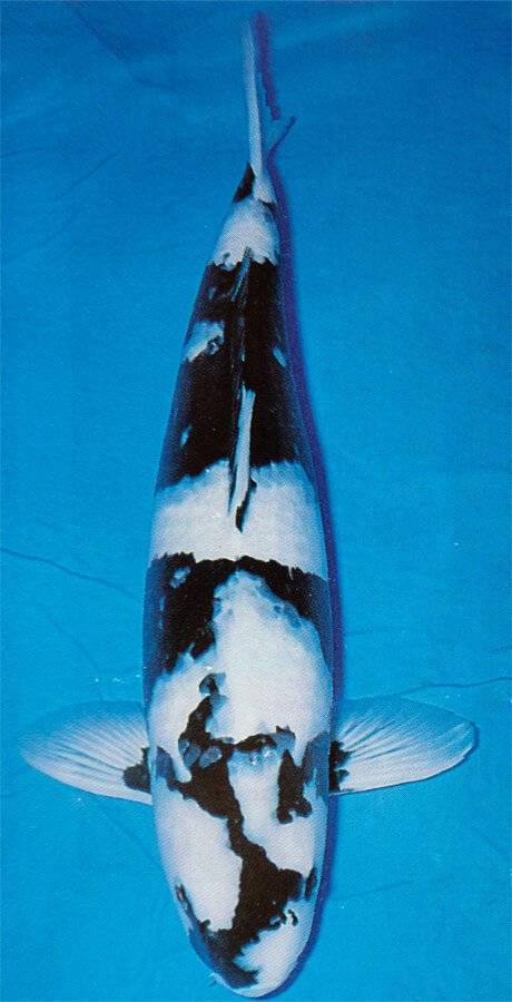 - SHIRO UTSURI: Koi, zwart van kleur met mooie grote sneeuwwitte vlekken. Deze mooie witte patronen mogen niet besmeurt zijn met zwarte spotjes.