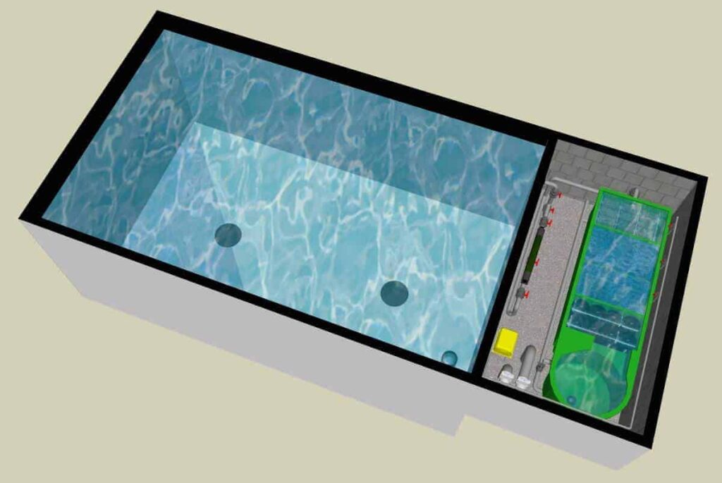 Extern filtersysteem op gelijke hoogte van de vijver dat werkt op basis van de zwaartekracht. Het water komt het filter binnen via de bodemdrains van de bodemdrainage.