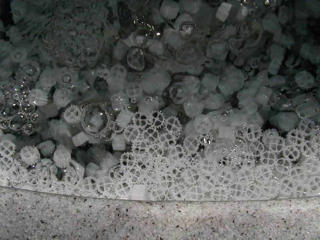 Biologisch filtermedia bestaande uit 6 bij 8 mm kunststof vormpjes dat gebruikt wordt in bewegend bed (moving bed) kamers.