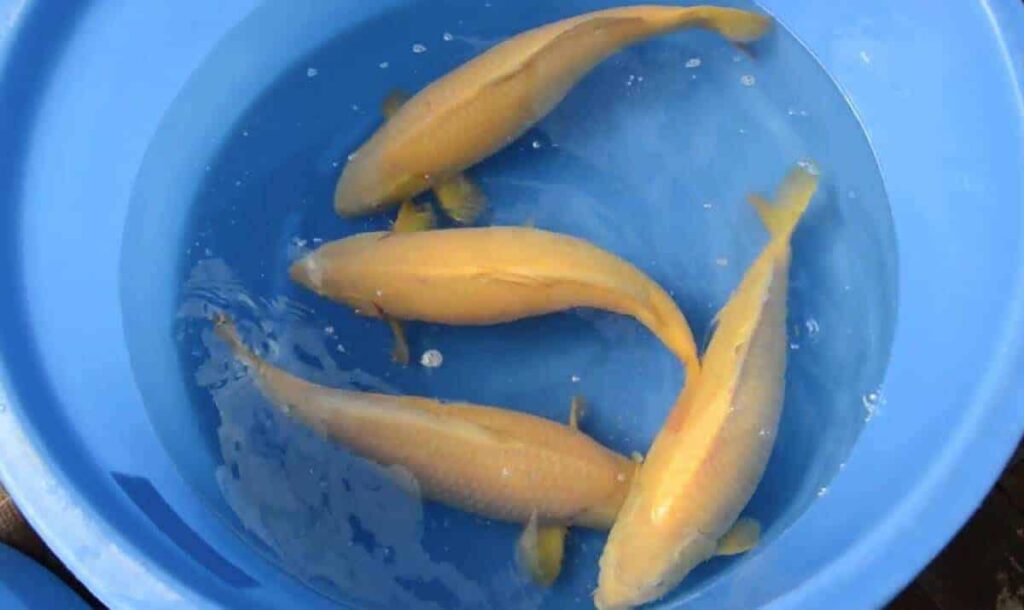 Een éénkleurige, niet-metallic (niet metaalglanzend) koi met een mosterd gele kleur.