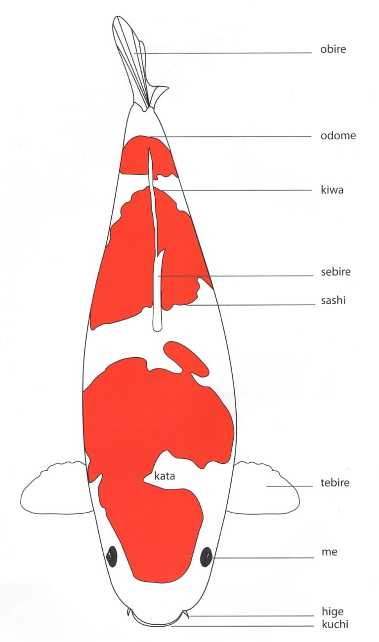 De wazige overgang tussen het begin van het rood of zwart patroon en het wit, bekeken van kop naar staart.