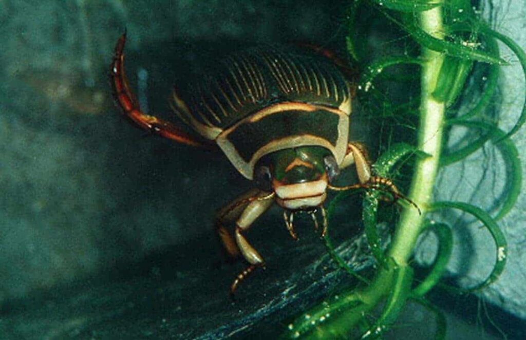Een felle beet in onze vinger tijdens het opruimen van een teveel aan planten doet ons opschrikken. Het is een grote bruinolijfgroene kever met gele randen die de boosdoener blijkt te zijn, een geelgerande watertor. Neen, het is echt geen lieverdje, maar toch wordt hij door de wetgevers beschermd want hij is bedreigd.