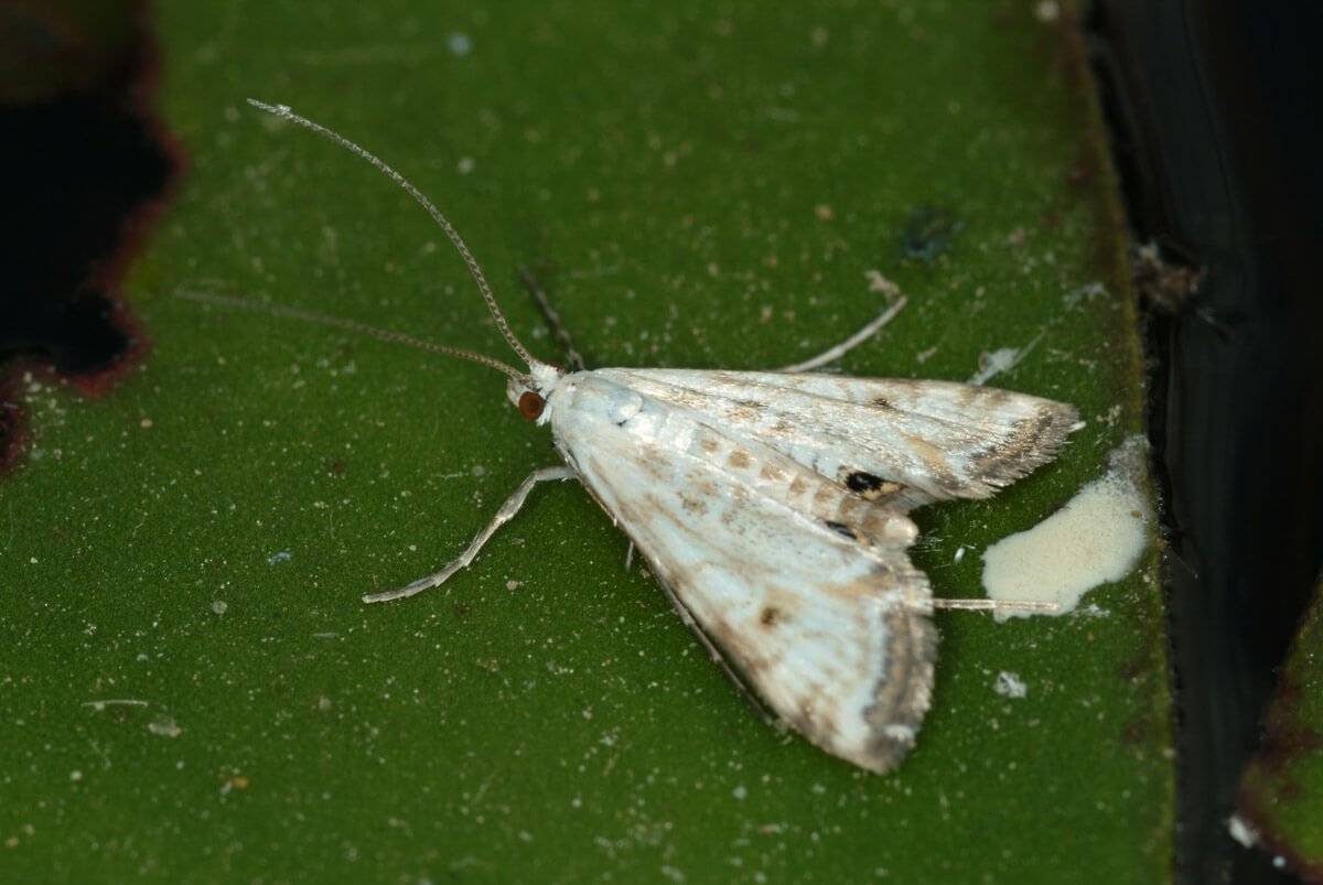 De witte vlindertjes (Cataclysta lemnata) vliegen rond van mei tot begin oktober en komen voor langs vijvers, poelen, rivieren en plassen. Het gaat hier om een motvlindertje met een spanwijdte van 15-25 mm. De achtervleugels van het motvlindertje zijn wit met donkere vlekjes en banden . De voorvleugels zijn vrij smal en de poten van deze mot zijn vrij lang. De voorvleugels van het mannetje zijn wit met een erg zwakke, bruinige tekening. De voorvleugels van het wijfje zijn eerder lichtbruin met een donkere tekening. Het wijfje is groter dan het mannetje. Ze verwijderen zich niet ver van het water waaruit ze geboren zijn en zijn dus eerder sedentair.
